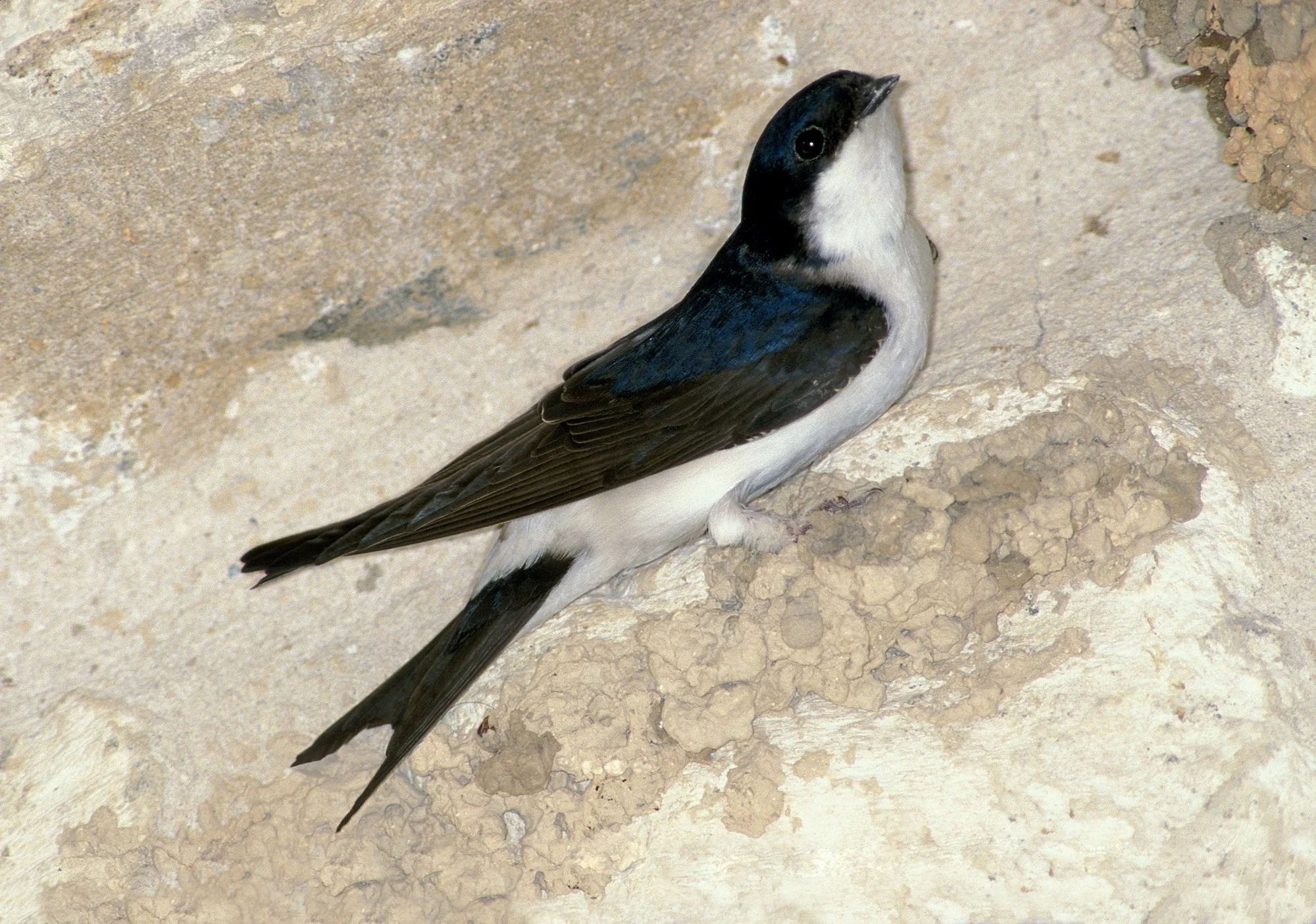 Above: A House Martin in the process of creating a natural nest cup from mud and saliva. Artificial nest boxes save them the effort, and boost their chances of breeding success. Photo ©Paul Sterry/Nature Photographers Ltd