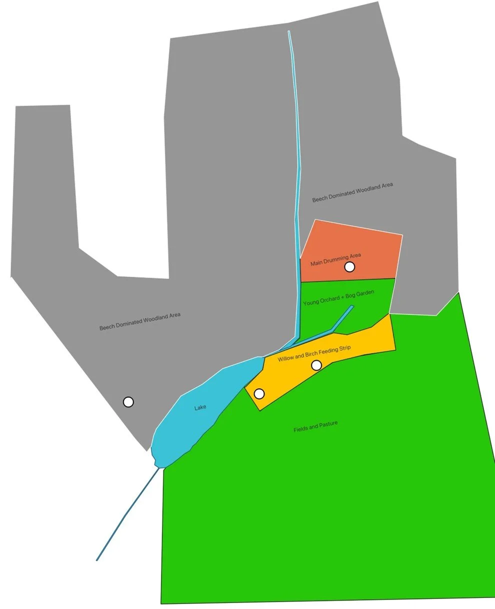 A map of the site photographed in the image below. The white circles show locations at which LSW were detected. The labels show habitat and/or their potential significance to the birds.